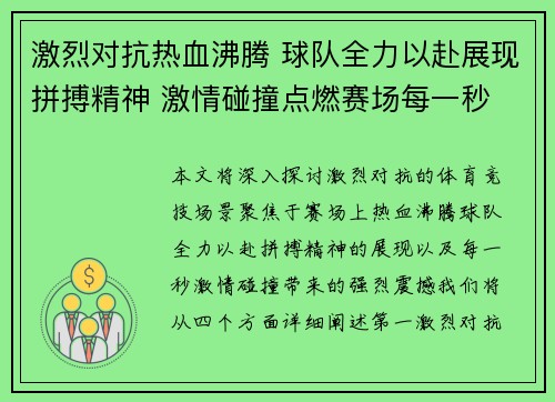 本文将深入探讨激烈对抗的体育竞技场景,聚焦于赛场上热血沸腾、球队全力以赴、拼搏精神的展现以及每一秒激情碰撞带来的强烈震撼。我们将从四个方面详细阐述:第一,激烈对抗中的战术较量,如何决定比赛的走向;第二...