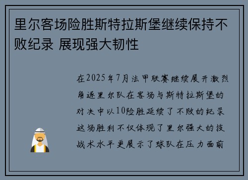 在2025年7月,法甲联赛继续展开激烈角逐,里尔队在客场与斯特拉斯堡的对决中以1-0险胜,延续了不败的纪录。这场胜利不仅体现了里尔强大的技战术水平,更展示了球队在压力面前所表现出的坚韧意志和顽强斗志。...